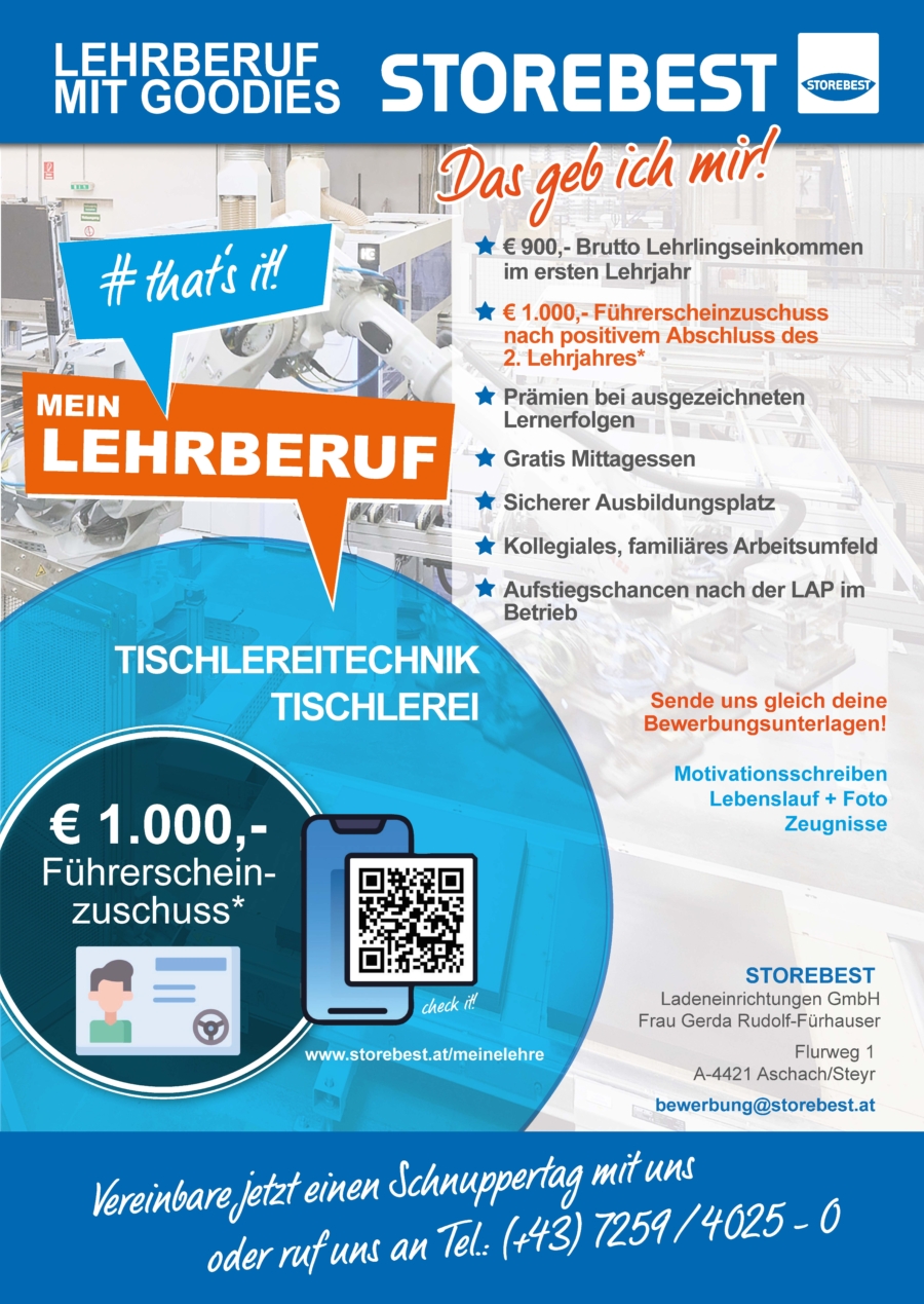 STOREBEST zählt zu den führenden Objekteinrichtern für Einzelhandel, Arztpraxen, Büros, Apotheken und Friseursalons. Mit modernster Fertigungstechnik und einem starken Innovationsgeist bieten wir Lehrlingen ein zukunftsorientiertes Ausbildungsumfeld mit besten Perspektiven.